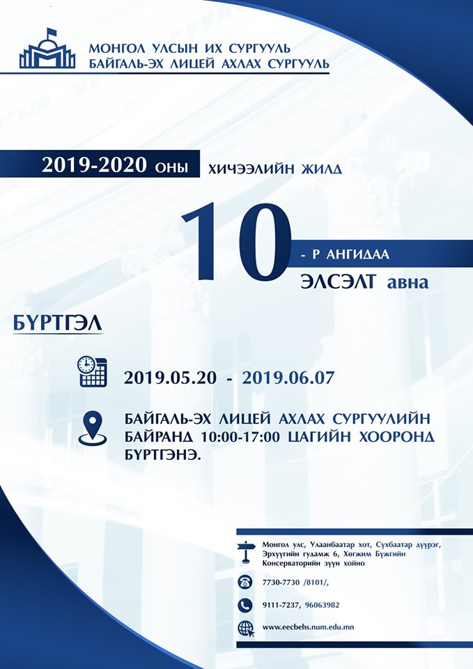 Математик, байгалийн ухааны гүнзгийрүүлсэн сургалттай “БАЙГАЛЬ-ЭХ” лицей ахлах сургуульд элсэн суралцахыг урьж байна. БҮРТГЭЛИЙН МАТЕРИАЛ: Тѳрсний гэрчилгээ Сүүлийн 6-н сарын дотор авaхуулсан 3 хувь цээж зураг Бүртгэлийн хураамж 10000 тѳгрѳг. ЭЛСЭЛТИЙН ШАЛГАЛТ: Нийт бүртгүүлэгчдээс математик болон байгалийн ухааны (физик, хими, биологи, газарзүй) шалгалтыг 2019 оны 06 сарын 08-ны 10 цагт “БАЙГАЛЬ-ЭХ” лицей ахлах сургуулийн хичээлийн […]