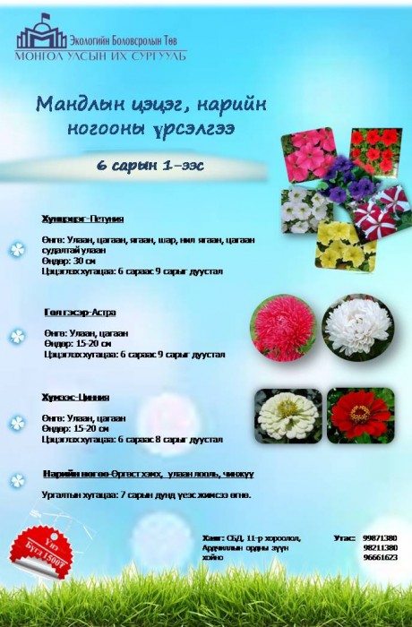 Мандлын цэцэг, нарийн ногооны үрсэлгээ худалдаална Нийтэлсэн: Оюунбилэг Сэтгэгдэл байхгүй 6 сарын 1-ээс эхлэн мандлын цэцэг, нарийн ногооны үрсэлгээ худалдаална