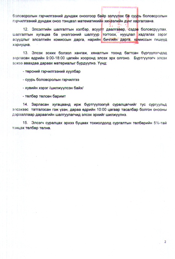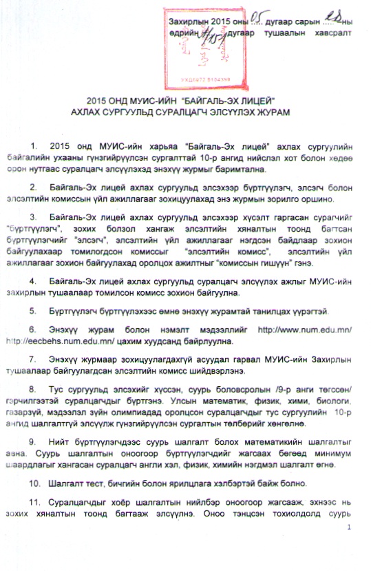 2015 онд МУИС-ийн “Байгаль-Эх лицей” ахлах сургуульд суралцагч элсүүлэх журам Нийтэлсэн: Саранзаяа Сэтгэгдэл байхгүй
