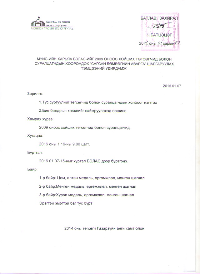 БЭЛАС-ийг 2009 оноос хойш төгсөгчид болон суралцагчдын хооронд “Сагсан бөмбөгийн аварга” шалгаруулах тэмцээний удирдамж Нийтэлсэн: Саранзаяа Сэтгэгдэл байхгүй