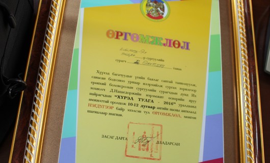 Энэ насны ангилалд өрсөлдсөн 45 суралцагчаас манай сургуулийн Биологийн 12 дугаар ангийн суралцагч Д.Энхтуул 1-р байр эзэлж Утга зохиол, нийгмийн ажилтны дээд сургуульд суралцах эрх, нийслэлийн “Хүрэл тулга-2016” яруу найрагчдын уралдаанд оролцох эрхийн бичиг авлаа.