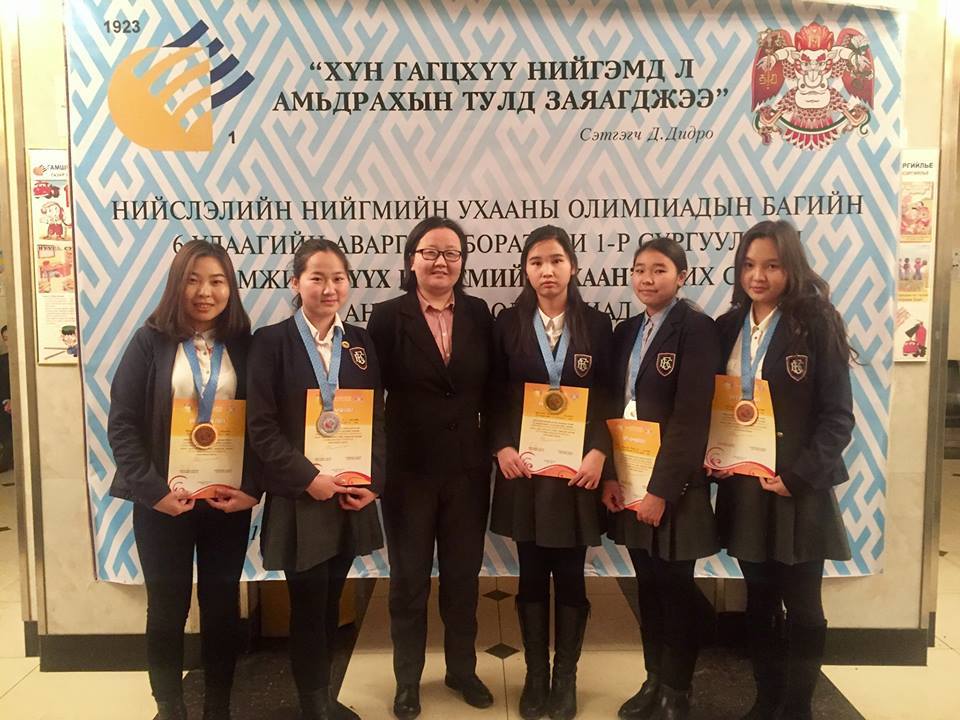 Нийслэлийн нийгмийн ухааны олимпиадын багийн 6 удаагийн аварга 1-р сургуулийн нэрэмжит нийгмийн ухааны олимпиадад 12А анги У.Алтанцэцэг- АЛТ, 12А анги Х.Нинжцэцэн- МӨНГӨ, 12Б анги н.Оюу-Эрдэнэ-МӨНГӨ, 12Д анги А.Төгөлдөр-МӨНГӨ, 12А анги У.Ариун-Эрдэнэ-ХҮРЭЛ, 12А анги Г.Оюунтунгалаг -ХҮРЭЛ медаль тус тус хүртлээ.