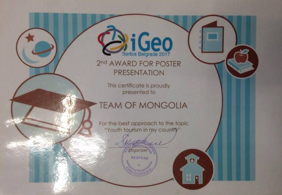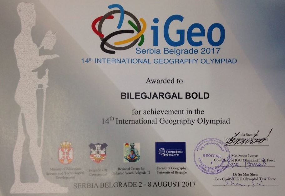 Бүгд Найрамдах Серби улсын нийслэл Белград хотод 2017 оны 08 дугаар сарын 02-08-ны өдрүүдэд явагдсан Олон улсын газар зүйн XIV олимпиадад 12Д ангийн суралцагч Б.Билэгжаргал Монгол Улсын багийг төлөөлөх 3 суралцагчийн бүрэлдэхүүнд багтан амжилттай оролцож, “Манай улсын залуучуудын аялал жуулчлал” сэдэвт зурагт хуудас танилцуулах тэмцээнд дэд байранд шалгарч эх орныхоо нэрийг өндөрт өргөсөнд талархал дэвшүүлье.