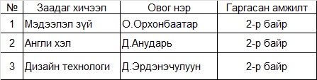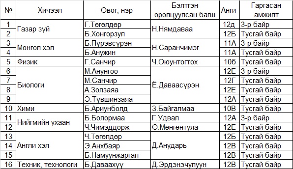 Сүхбаатар дүүргийн төрөлжсөн олимпиадад манай багш, суралцагчид амжилттай оролцлоо Нийтэлсэн: Саранзаяа Сэтгэгдэл байхгүй Суралцагчид: Багш нар: